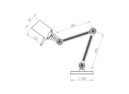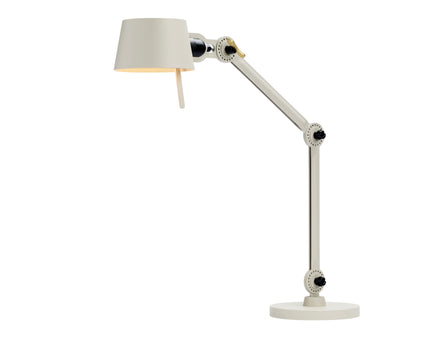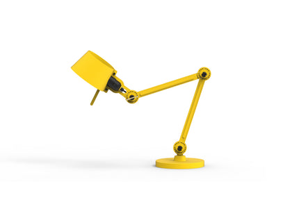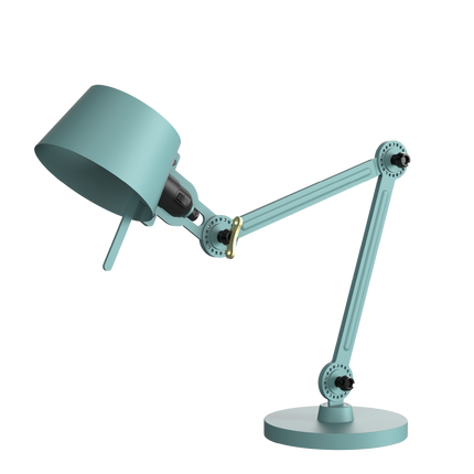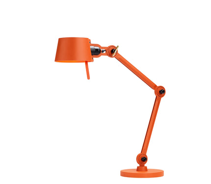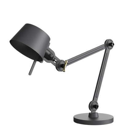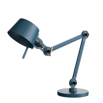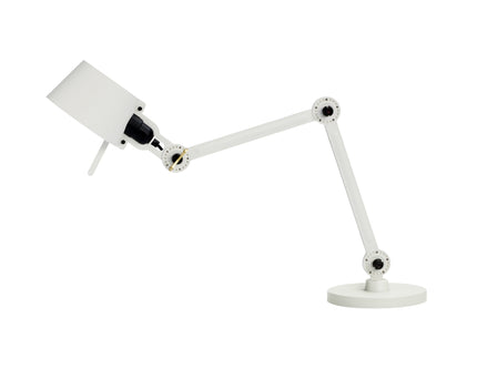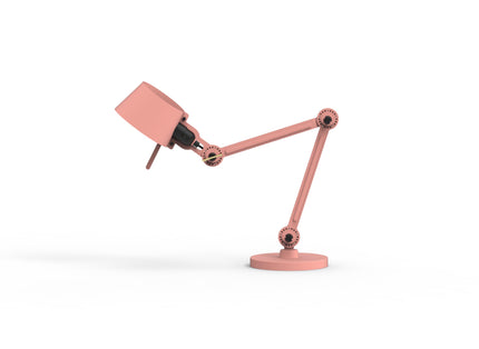Small double arm desk lamp with foot in coated steel and shade in coated aluminium. The lamp head and arm are adjustable with special wingnuts.