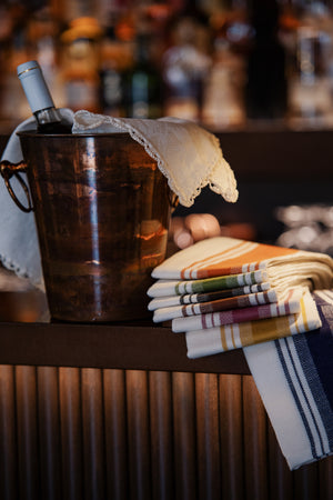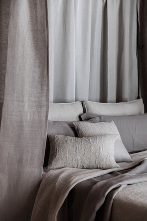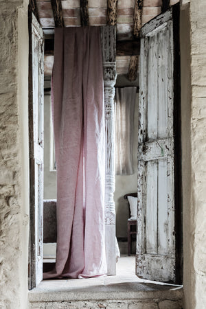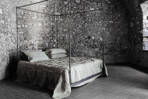 The Busatti family have been artisan weavers of linen and cotton in Anghiari, Tuscany, since 1842. Every phase of production is carried out in Italy. From the dyeing, spinning and weaving of the fabrics, every piece is carefully hand-finished in the Busatti workshop in the cellars of the historic Palazzo Morgalanti. Raw threads are treated with olive oil before spinning and dyed singly before weaving. Shuttle looms slowly insert weft-threads to impart a sheen and softness not often found in modern fabrics.