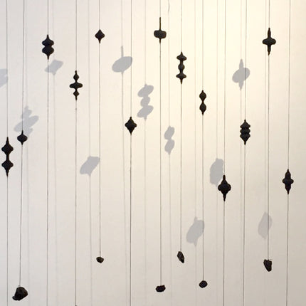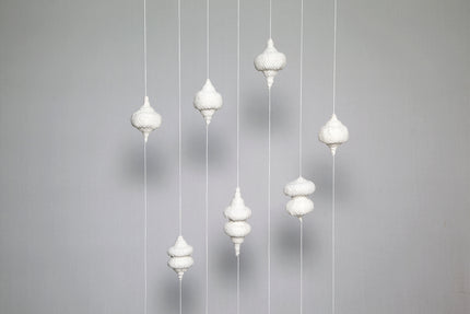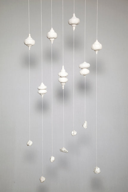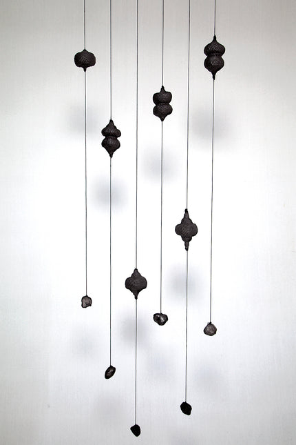 Hanging Pods - ceramic dipped woven cotton sculptures with ceramic-dipped stone.