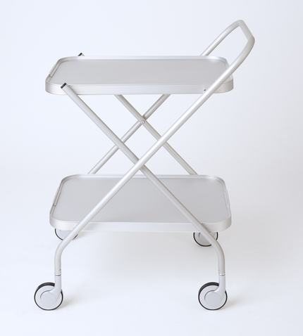 The Kaymet Folding Trolley has been made by Kaymet, London since the 1950s. The anodised silver aluminium light-weight fold-down trolley with embossed diamond pattern and ribbed extruded edge sections. Also available in gold with or without rubber grips - POA.