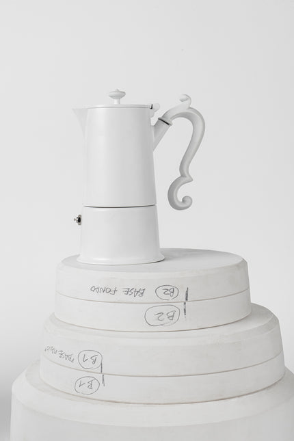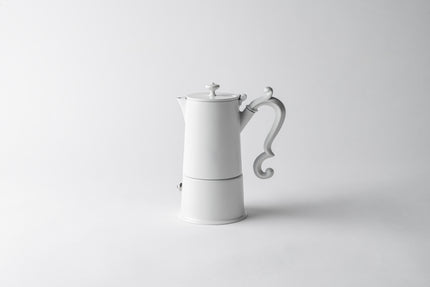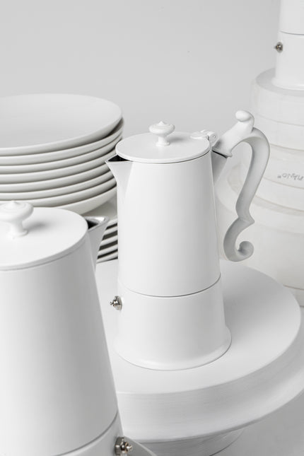 Bringing together timeless beauty and original forms, Lady Anne draws inspiration from the refined silver coffee sets of the eighteenth century, revisited with a functional approach, to make coffee as tradition demands and to serve it with elegance. This total white version exalts the clean lines of the truncated cone shaped body in contrast with the sinuosity of the handle, making the coffee pot into a veritable centrepiece.