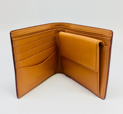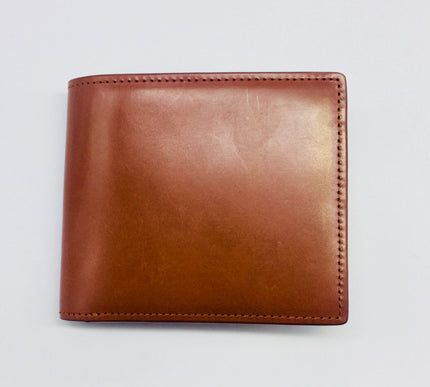 Bridle leather and Italian leather contemporary and luxurious bifold wallets, made by Japanese artisans. Chestnut exterior and lighter chestnut colour leather on the interior with four card pockets, coin section, one open pocket and two long open pockets for receipts and notes.