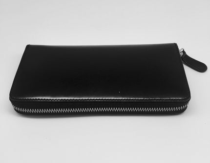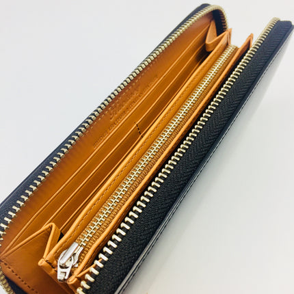 Large zip around purse/ wallet made by Japanese artisans from the finest English bridle leather and Italian leather. Contemporary and luxurious, the black exterior and chestnut leather on the interior contains 12 card pockets, zipped central coin section and four long open pockets for receipts and notes and even a passport, making it a great travel accessory!