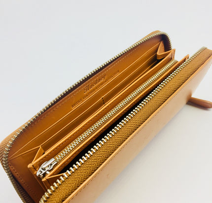Large zip around purse/ wallet made by Japanese artisans from the finest English bridle leather and Italian leather. Contemporary and luxurious, the tan exterior and interior contains 12 card pockets, zipped central coin section and four long open pockets for receipts and notes and even a passport, making it a great travel accessory!