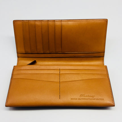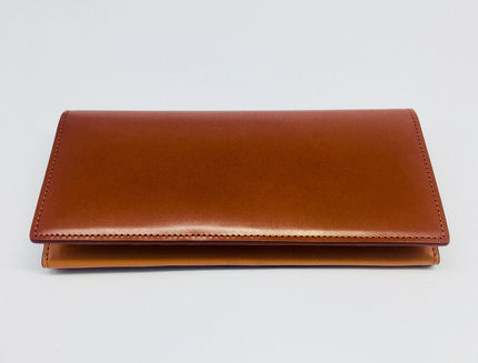 Long bi-fold purse/ wallet made by Japanese artisans from the finest English bridle leather and Italian leather. Contemporary and luxurious, the chestnut exterior and tan leather on the interior contains 13 card pockets, zipped side coin section and four long open pockets for receipts and notes.