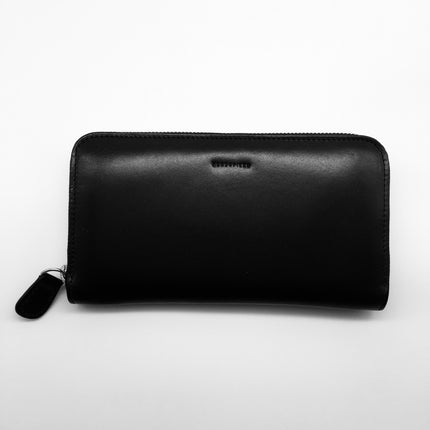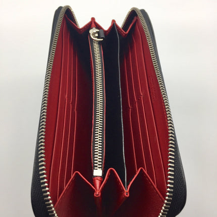 Large zip around purse/ wallet made from 100% vegetable tanned leather and made in Florence for Mondopiero. Black exterior with zipped pocket on one side and burst of red leather on the interior with 12 card pockets, zipped central coin section and five long open pockets for receipts and notes and even a passport, making it a great travel accessory!