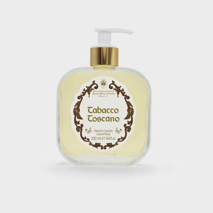 Tabacco Toscano: the mysterious and velvety fragrance of Officina Profumo-Farmaceutica di Santa Maria Novella. The liquid soap is formulated with surfactants of vegetable origin and enriched with natural saponins. The formula is completed with calendula extract, chosen for its softening properties.