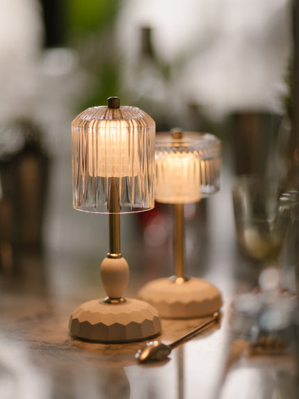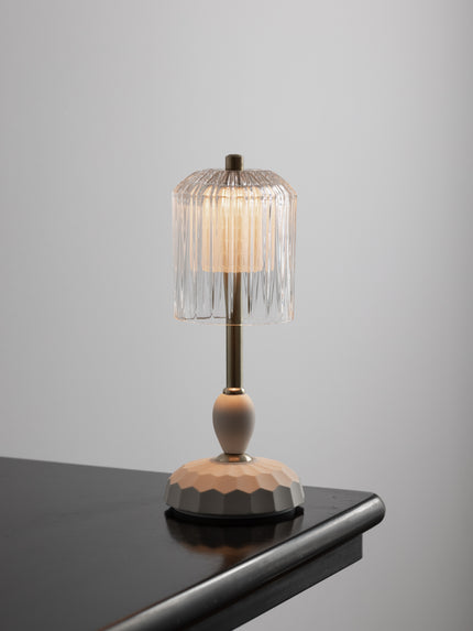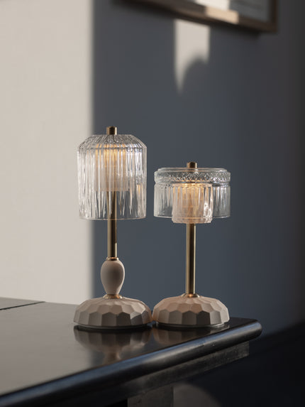 Studio Kalff, NL's addition to their lighting collection of candlelights, pendant lights and lamps - the NEW portable, dimmableLED table lamps, with a ceramic base, brass, and glass shades, perfect for creating a captivating ambiance in any cozy environment. material: glass-porcelain -brass