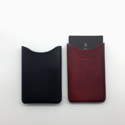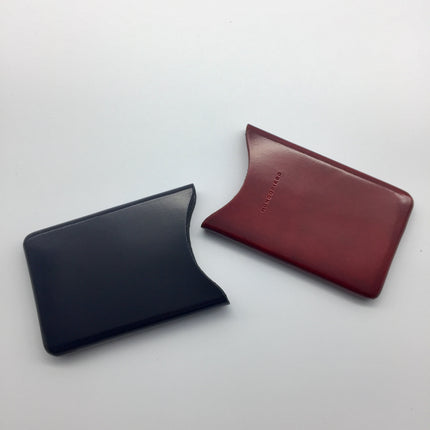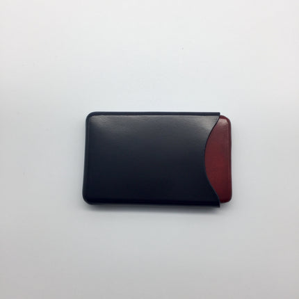 Vertical business card holder, in two pieces, without seams, in hand stitched vegetable tanned leather. One piece in red and the other in navy.