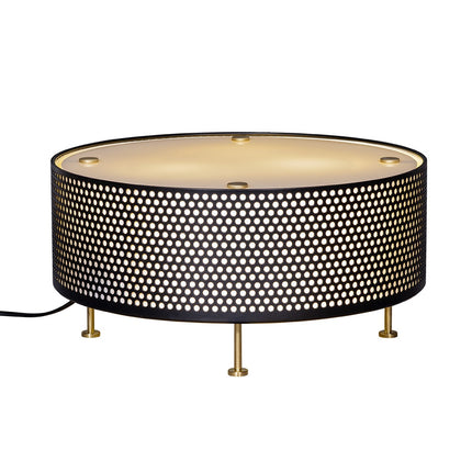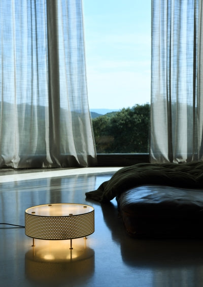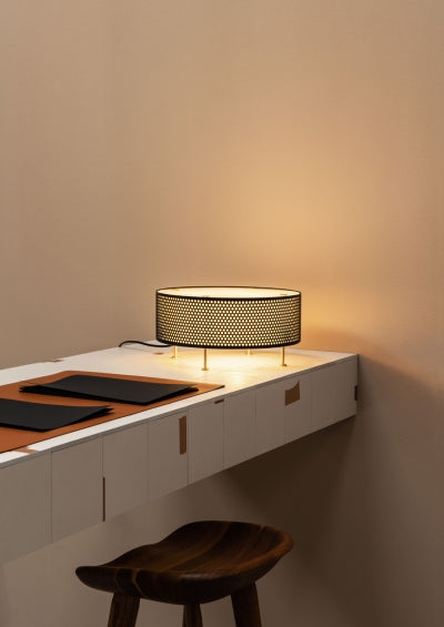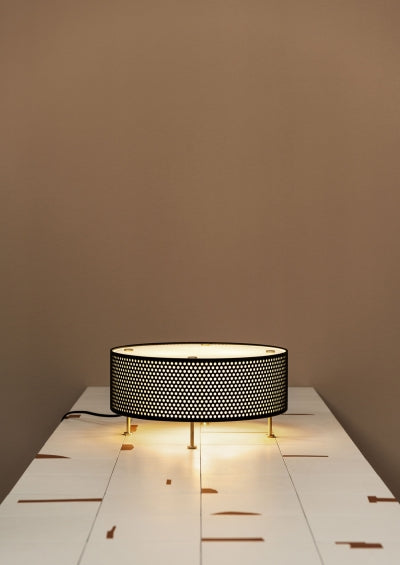 This table lamp G50 was designed by Pierre Guariche in the 1950s. It uses a diffusing screen that closes a perforated sheet metal drum lined with an opal film,and is carried by four brass feet. This lamp returns light to its base live, by reflection on the surface that welcomes it, but also indirectly by its very soft opal screen. It animates a console, a shelf or a bedside table. It is available in two finishes (white and black).