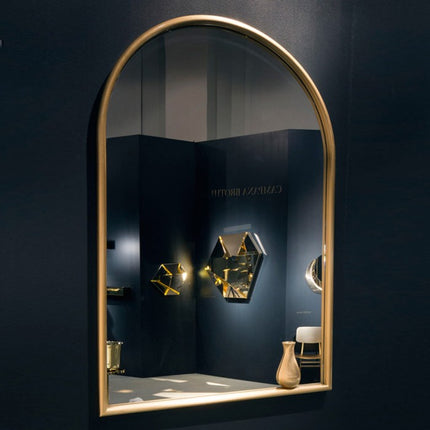 A classic Renaissance monofora is the form that inspired the mirror. The arc is defined by brass profile rounded at the bottom, just like on a windowsill to lean on, then a jar appear: poetic quotations that lead to the practice of the portrait and games of reflections.