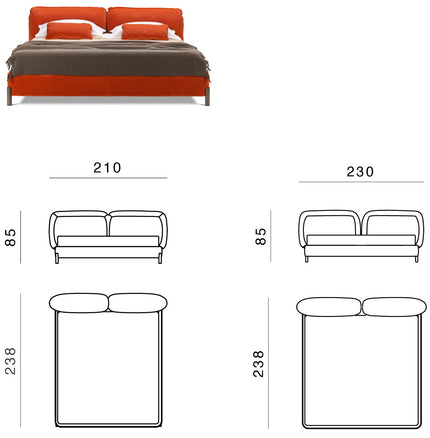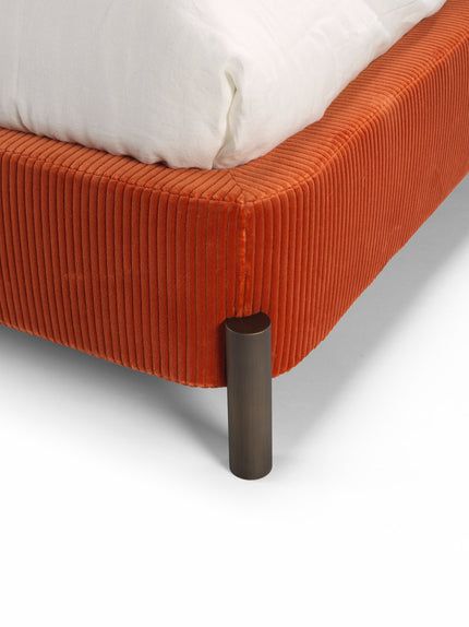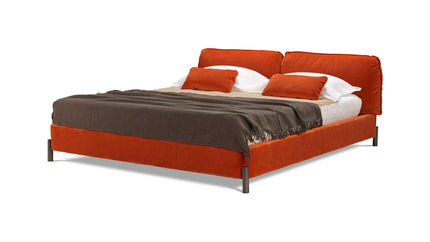 The headboard of the Tarantino bed is made from a lavish structure of soft goose down cushions upholstered in noble fabrics or natural leathers. The base is composed of four casted aluminum feet, that can be configured with the extensive range of metal finishes available.