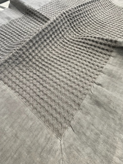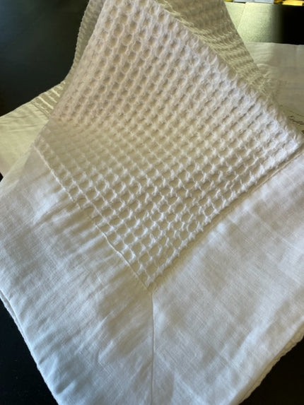 100% cotton waffle woven bath mat with matching linen border. Made in Italy.