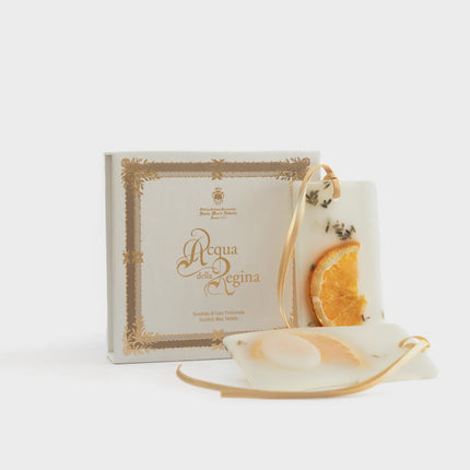 The box contains two hand-made scented wax tablets, inspired by the Acqua della Regina Cologne fragrance and its notes of citrus fruits, neroli and musk.